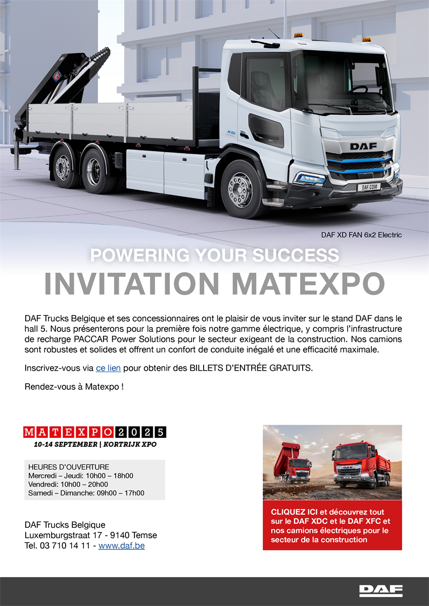 La 42ème édition de MATEXPO aura lieu du 8 au 12 septembre 2027 à Kortrijk Xpo. Le salon offre un aperçu des derniers développements en matière de machines de construction, de matériaux de construction et de véhicules de construction.
